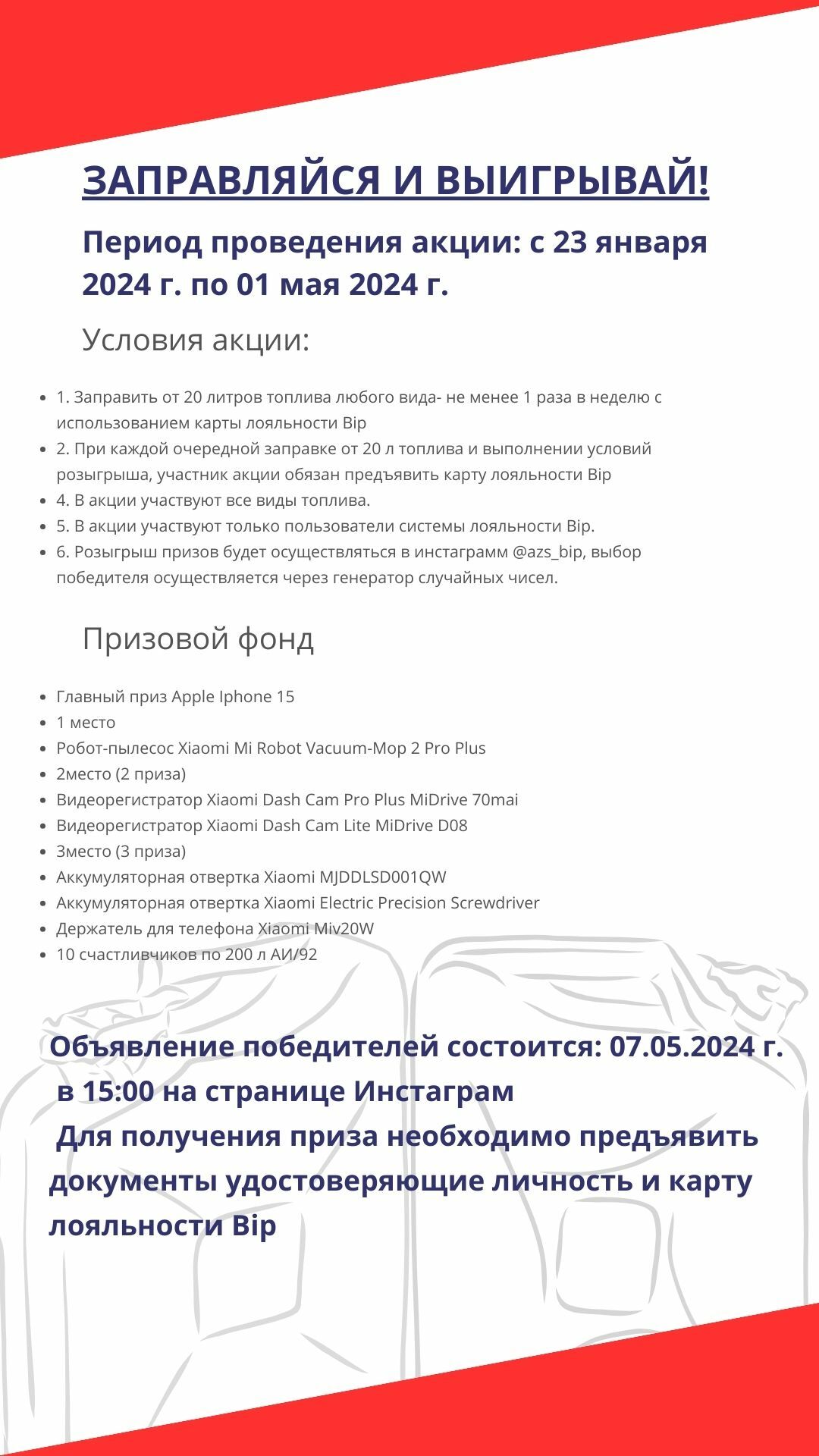 ЗАПРАВЛЯЙСЯ И ВЫИГРАЙ!Период проведения акции: с 23 января 2024 г. по 01 мая 2024 г.